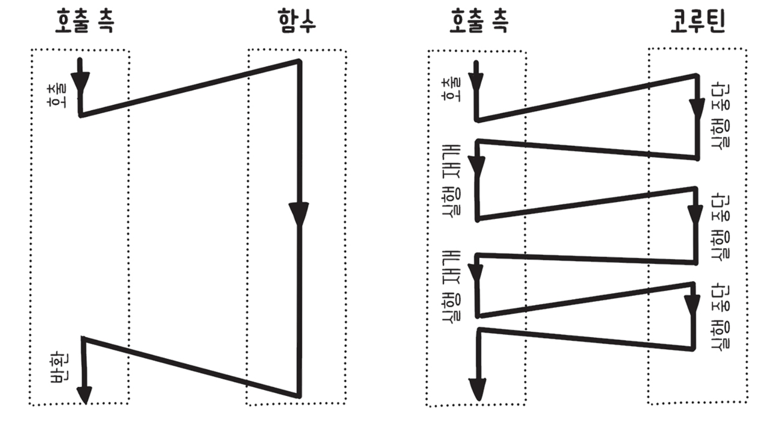 - 원하는 시점에 특정 코루틴의 실행을 중단하고 다른 작업의 실행을 대신 재개 가능