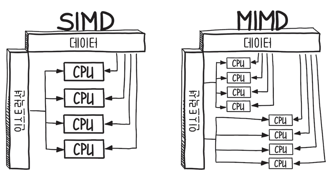 - 다중 명렬-다중 데이터(Multiple Instruction Multiple Data, MIMD)