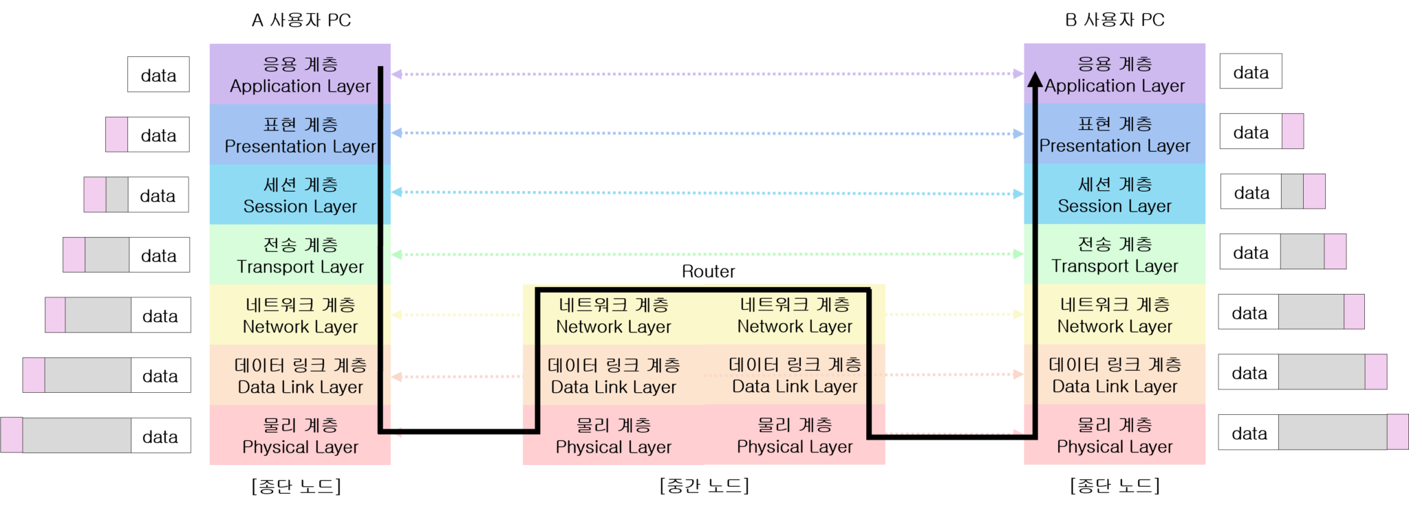 이론적인 표준 모델. 위 그림은 OSI 7계층을 표현한다.