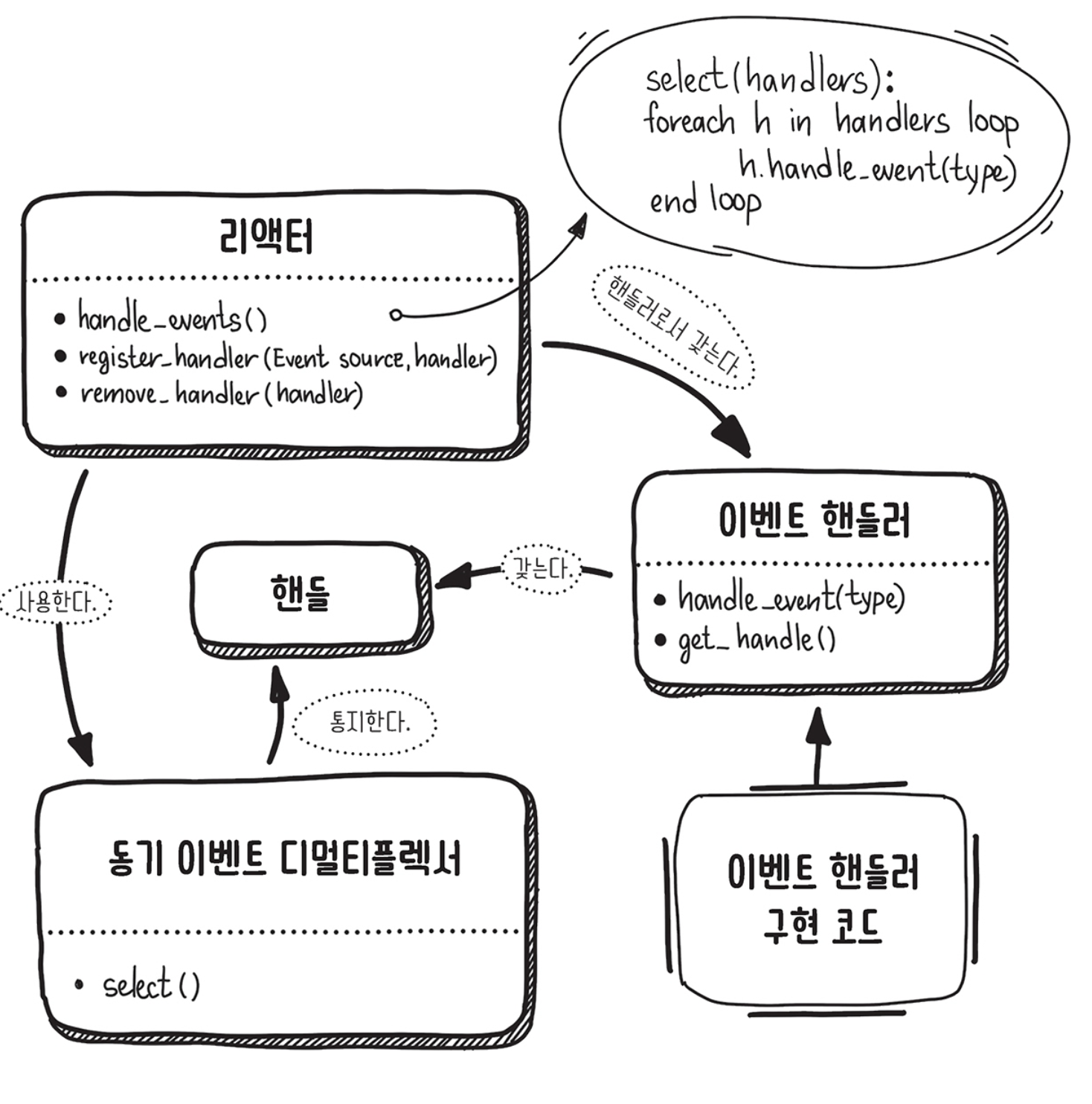 리액터 패턴 구현한 애플리케이션은 이벤트 소스와 애플리케이션의 관심 대상인 이벤트를 등록함. 그리고 이벤트의 종류마다 이를 처리할 이벤트 핸들러, 즉 콜백도 등록. 동기 이벤트 디멀티플렉서는 이벤트가 발생하기를 기다렸다가 리액터에 알린다. 리액터는 발생한 이벤트를 적합한 이벤트 핸들러에 맡겨 처리함