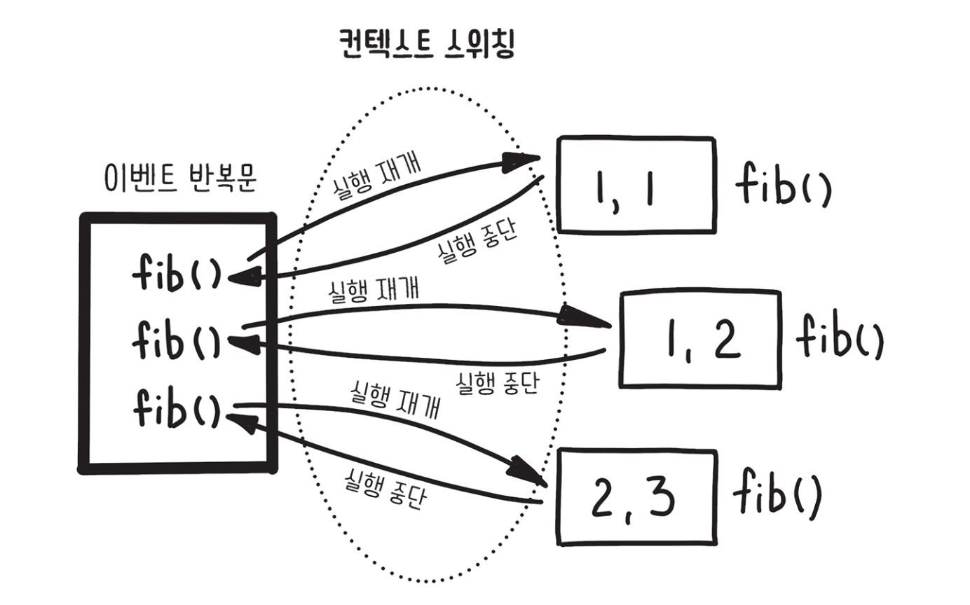 • 원하는 시점에 특정 코루틴의 실행을 중단하고 다른 작업의 실행을 대신 재개 가능