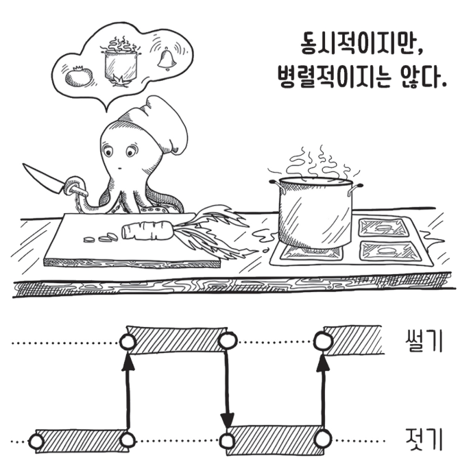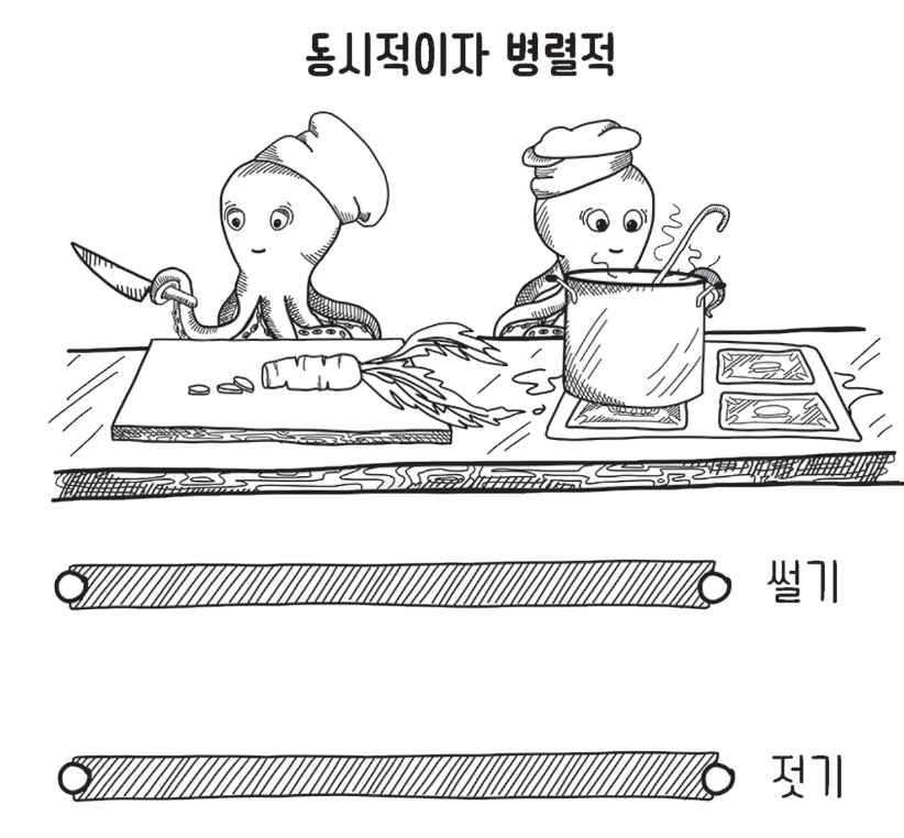 - “동시성은 여러가지를 한 번에 다루는 것이지만, 병렬성은 여러 가지 일을 동시에 하는 것”