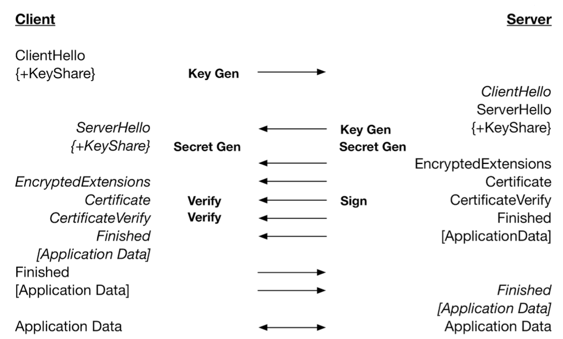 - CertificateVerify: 서버가 해당 인증서를 실제로 소유하고 있다는 것을 서명으로 증명 이 후 클라는 인증서 검증하며, 동시에 클라와 서버는 서로 교환한 ECDHE 공개키 바탕으로 세션키를 생성