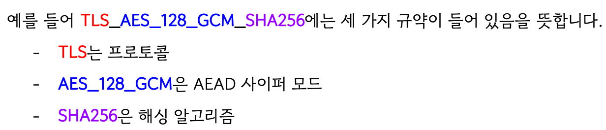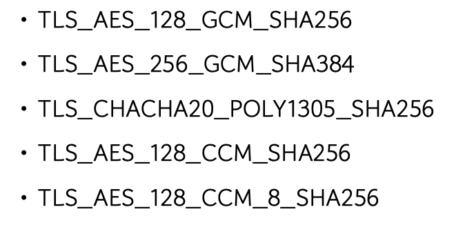 - 프로토콜, AEAD 사이퍼 모드, 해싱 알고리즘이 나열된 규약