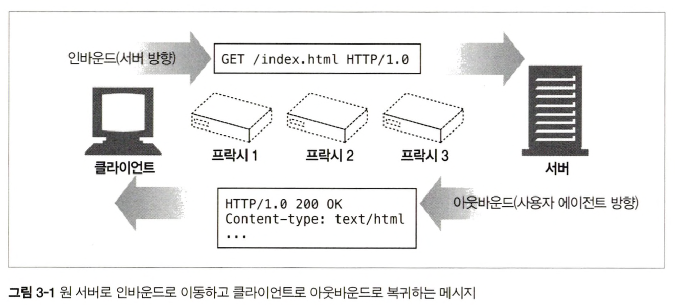 http는 인바운드와 아웃바운드라는 용어를 트랜잭션의 방향을 표현하기 위해 사용한다. 메시지가 원 서버로 향하는 것은 인바운드로 이동하는 것이고, 모든 처리가 끝난 뒤 메시지가 사용자 에이전트로 돌아오는 것은 아웃바운드로 이동하는 것이다.
