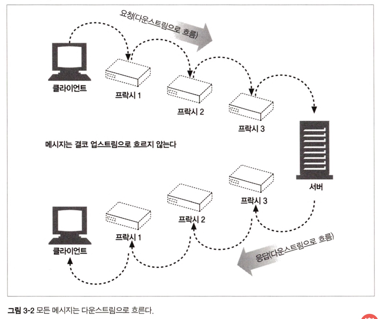 http 메시지는 강물과 같이 흐른다. 요청이든 응답메시지든 관계 없이 모든 메시지는 다운스트림으로 흐른다. 메시지 발송자는 수신자의 업스트림.