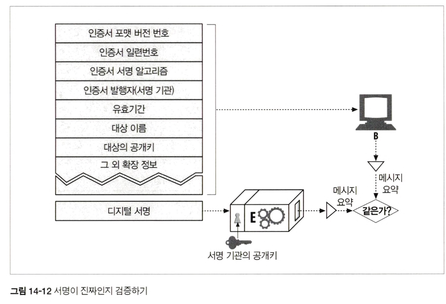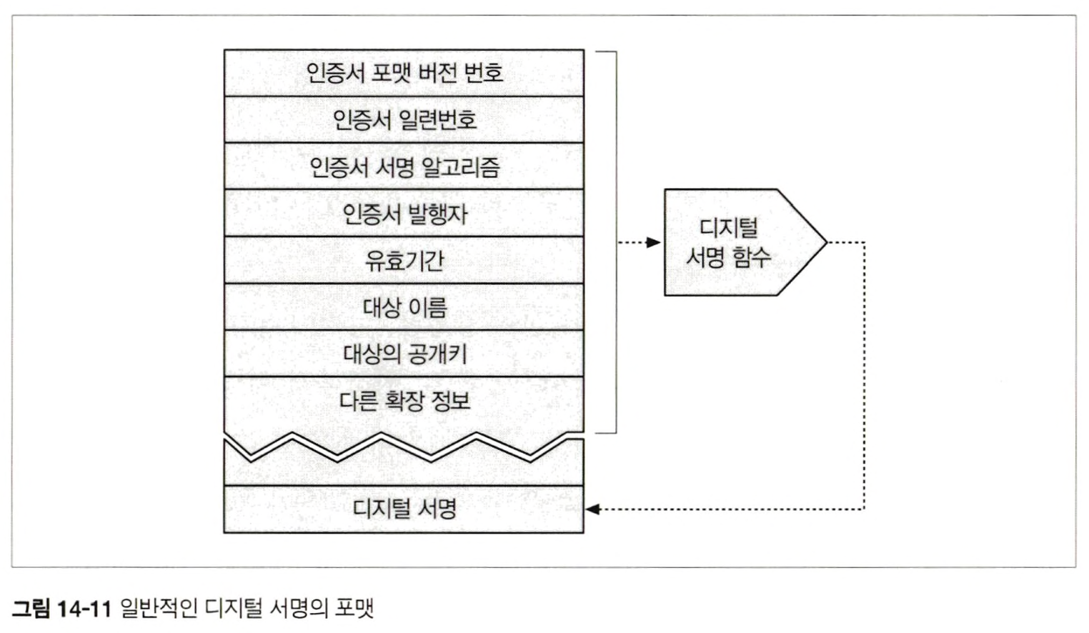 - 인즌서 발급자의 디지털 서명 디지털 인증서는 대상과 사용된 서명 알고리즘에대한 정보 + 대상의 공개키도 담음. 누구나 디지털 인증서 만들 수 있지만, 그 모두가 인즌서의 정보를 보증하고 인증서를 개인키로 서명할 수 있는 널리 인정받는 서명 권한 얻을 수 있는건 아님