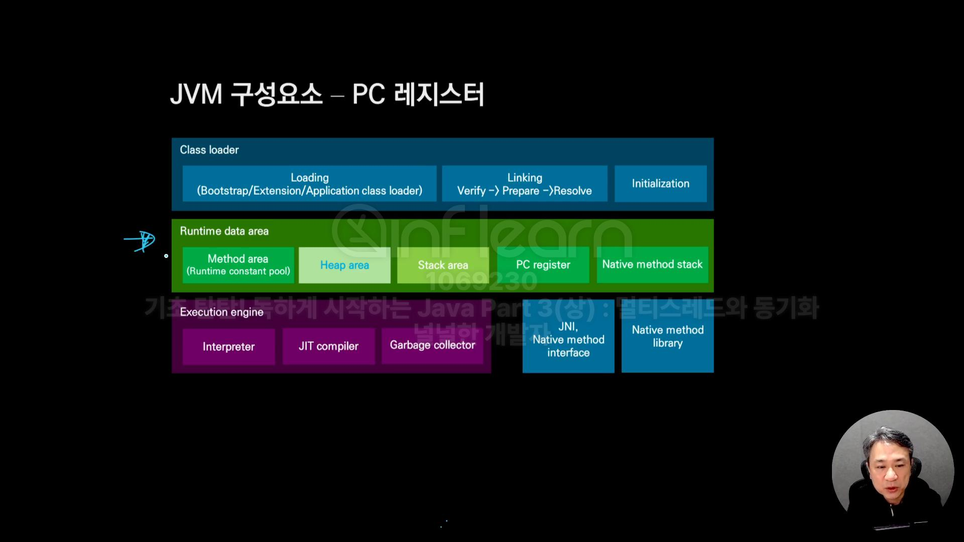 런타임 데이터 영역의 Stack area, PC register, Native method stack 이렇게 3개는 스레드마다 생성되고 가진다. PC 레지스터는 바이트코드 수준에서 다음 실행해야되는 위치가 저장된다.