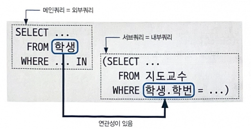 • 메인쿼리와 서브쿼리간 관계성이 있는 경우