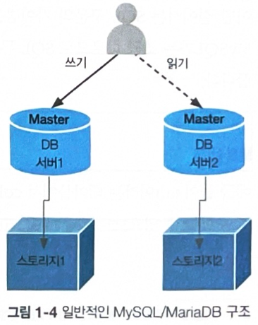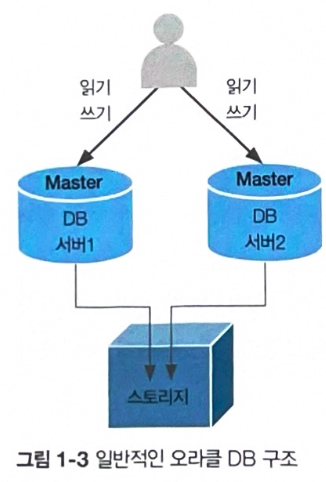 | 스토리지 구조(다중화 경우) | 통합된 스토리지 하나를 공유 | 물리적인 DB서버마다 독립적 스토리지 할당. |