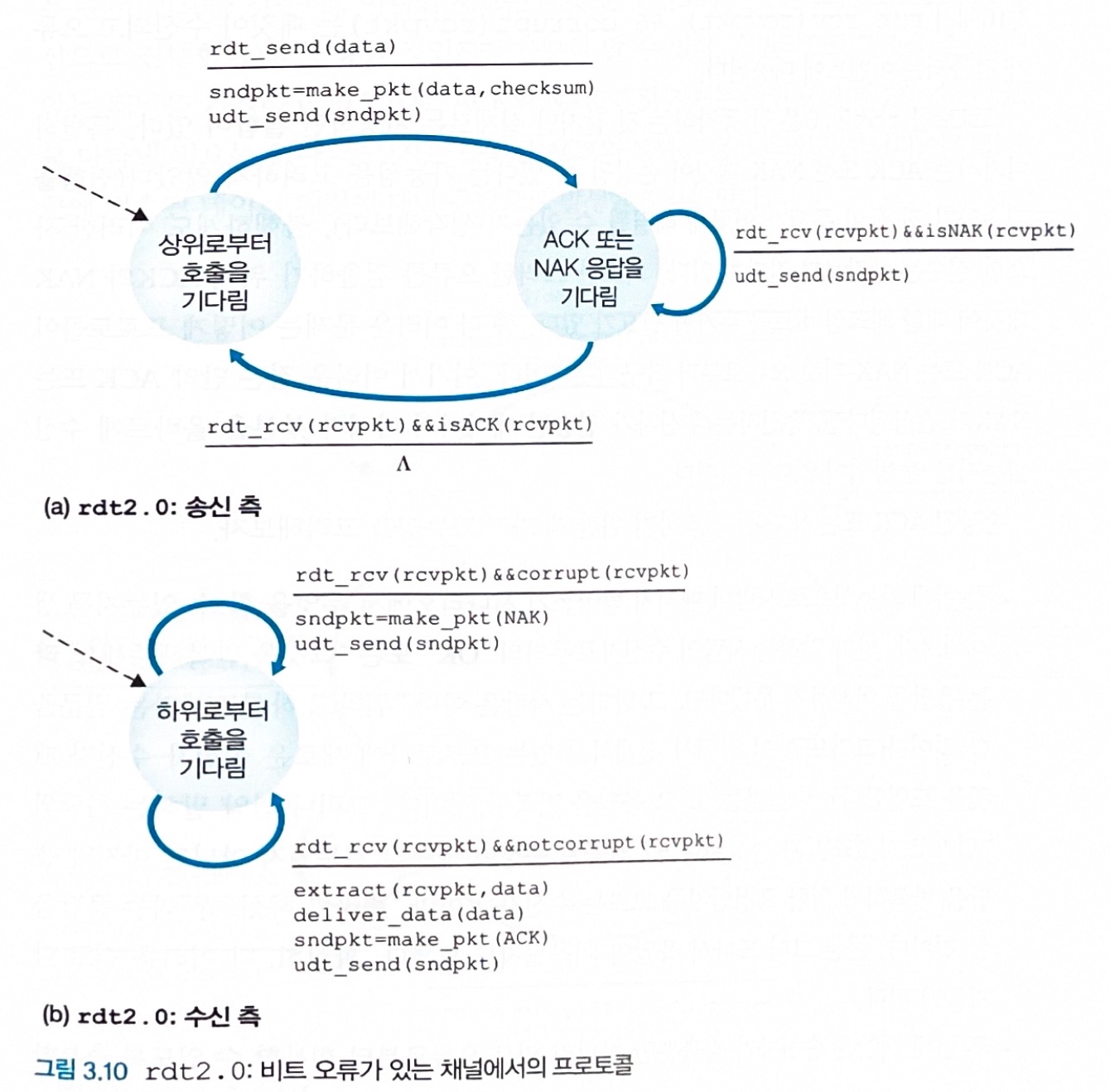 • 재전송: 수신자에서 오류를 가지고 수신된 패킷은 송신자에 의해 재전송 된다. 밑의 그림 3.10은 오류 검출, 긍정 확인응답 그리고 부정 확인응답들을 채택하는 데이터 전송 프로토콜 rdt 2.0의 FSM을 보여준다.
