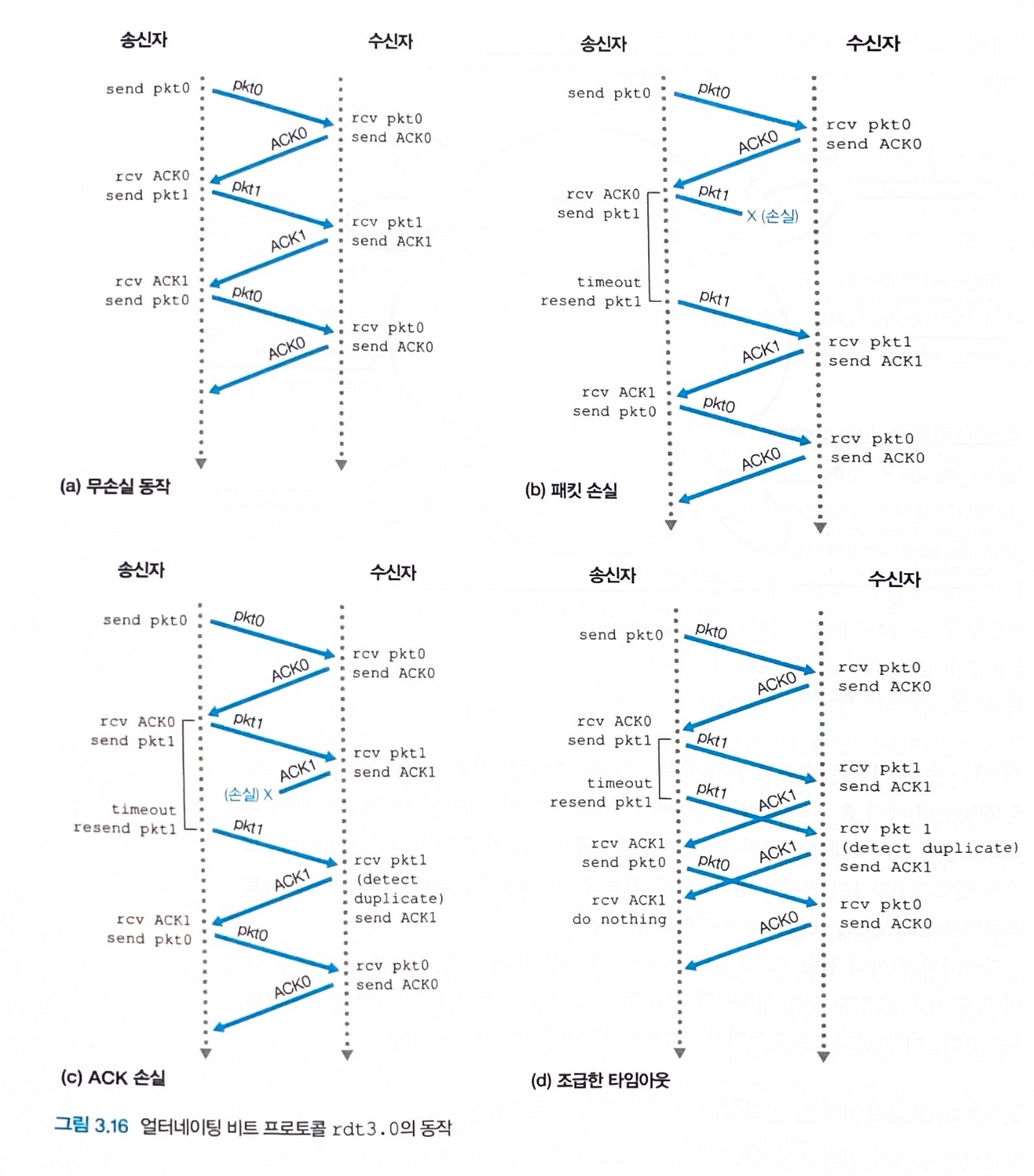 이 프로토콜의 좀 더 세세한 부분은 이 장 후반후의 과제에서 다룸. 패킷의 순서 번호가 0, 1이 번갈아 일어나므로, 프로토콜 rdt 3.0은 때때로 얼터네이팅 비트 프로토콜 (alternating-bit protocol) 이라고도 부른다.