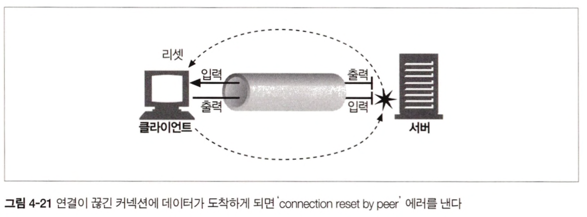 클라에서 더는 데이터를 보내지 않을 것임을 확신할 수 없는 이상, 커넥션의 입력 채널 끊는건 위험하다. 만약 클라에서 이미 끊긴 입력채널에 데이터 전송하면 4-21 그림같이 서버의 운영체제는 TCP ‘connection reset by peer’ 메시지를 클라에 보낼 것이다. 대부분 운영체제는 이것을 심각한 에러로 취급해 버퍼에 저장된, 아직 읽히지 않은 데이터 모두를 삭제한다. 이런 상황은 파이프라인 커넥션에서 더 악화됨.