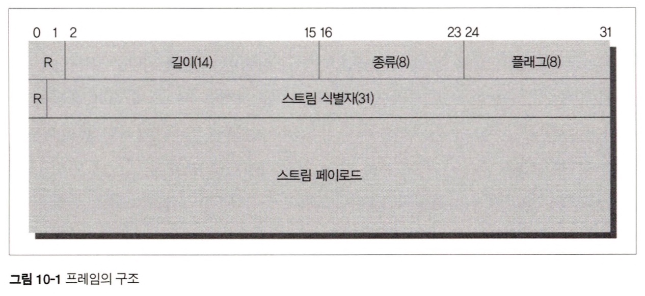 • 스트림 식별자: 31비트 스트림 식별자. 특별히 0은 커넥션 전체와 연관된 프레임임을 의미한다. HTTP/2.0은 DATA, HEADERS, PRIORITY, RST_STREAM, SETTINGS, PUSH_PROMISE, PING, GOAWAY, WINDOW_UPDATE, CONTINUATION 이라는 총 10가지 프레임을 정의하고 있으며, 페이로드의 형식이나 내용은 프레임의 종류에 따라 다르다.