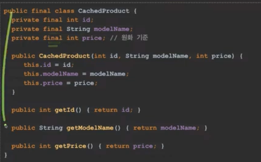 가격에 final을 붙이기. 나머지도 붙이고. 아 캐싱된 데이터는 불변객체로 만들자!