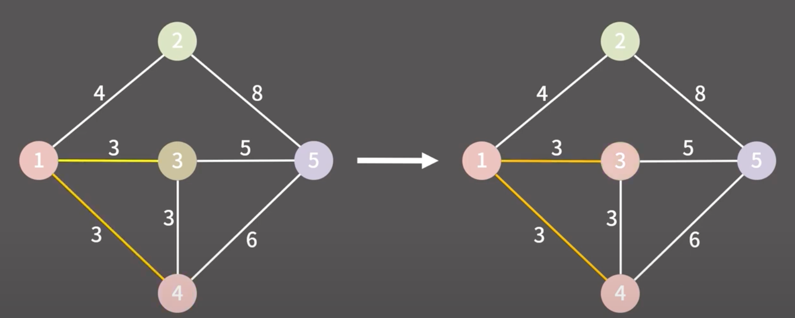 - 현재 선택한 간선이 정점 u, v 를 연결하는 간선이라고 할 때 만약 u와 v가 같은 그룹이라면 아무 것도 하지 않고 넘어가지만, 다른 그룹이라면 같은 그룹으로 만들고 현재 선택한 간선을 최소 신장 트리에 추가