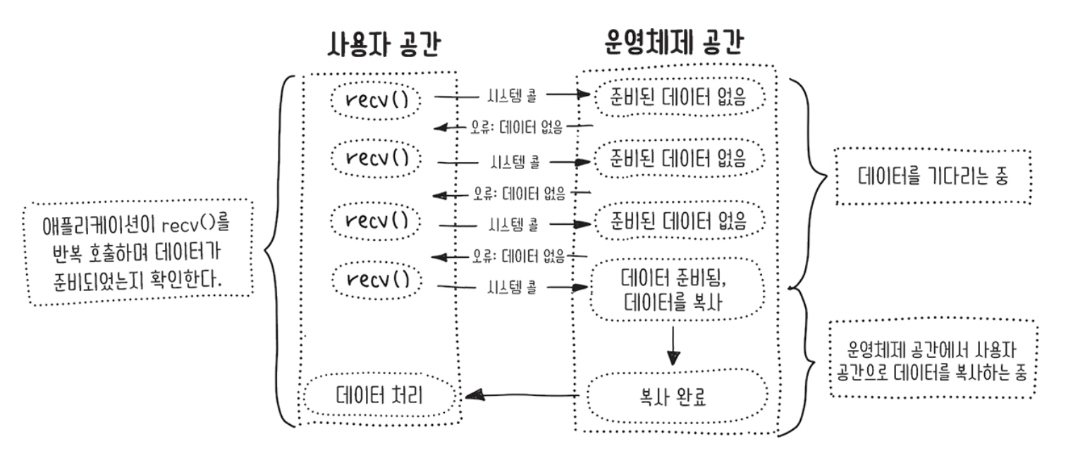 - 단점은… 데이터를 읽을 준비가 되었는지 주기적인 확인이 필요한 것! 다른 유형의 소켓 논블로킹 소캣