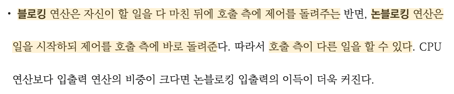 논블로킹 입출력이 빠르다는것은 오해!!! 반드시 빠른건 아님! 빠른게 아니라 CPU 띵가띵가 놀게 안두는게 핵심인것! 대신 입출력 기다리는 동안 애플리케이션이 다른 일 할 수 있도록 할뿐. 전체적인 성능향상 이어질수있음. 프로세서가 다른일 할 수 있으니