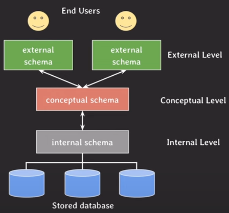 - 세가지 레벨 존재하며 각각의 레벨마다 스키마가 정의되어 있음.