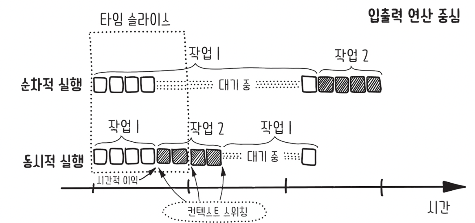 - 입출력 연산 중심에서는 컨텍스트 스위칭이 오히려 이점