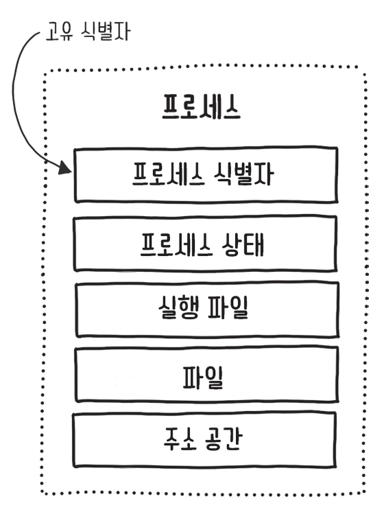 - 프로세스는 실행 파일, 프로그램이 쓰는 여러 자원(파일, 네트워크 연결)에 대한 정보, 내부 변수가 포함된 주소 공간 등 다양한 정보를 캡슐화 한 것