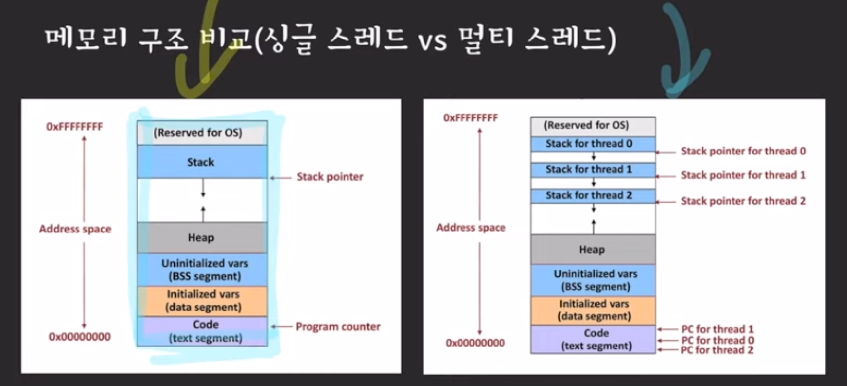 프로세스 코드, 데이터, 스택, 힙 메모리 영역 기반 다른 프로세스와 격리되어 프로세스간 통신위해 IPC 필요 한 프로세스 문제가 다른 프로세스와는 무관 스레드 스택 메모리 제외한 다른 메모리 영역을 같은 프로세스 내의 다른 스레드와 공유 다른 스레드와 격리 X, 그냥 통신 가능 한 스레드 문제 발생시 다른 스레드 영향 받을 수 있음