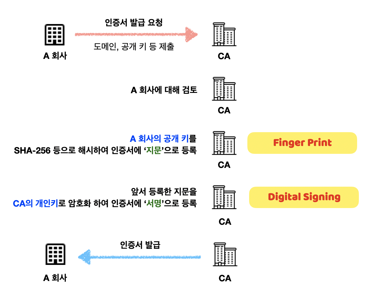 • A의 공개 키를 해싱하여 지문으로 만들고 이 지문을 또 CA의 개인 키로 암호화 하여 서명을 만들고 이 서명을 인증서에 박는다.